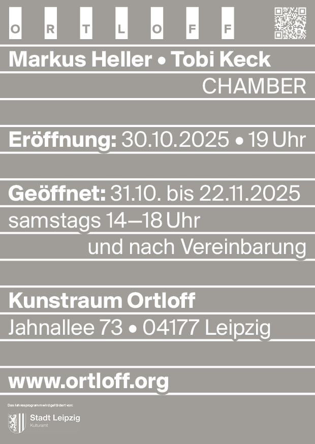 CHAMBER HYMN 30.10.2025 CHAMBER Markus Heller Tobi Keck Eröffnung: 30.10.2025, 19 Uhr Geöffnet: 31.10.— 22.11.2025 Samstags 14—18 Uhr und nach Vereinbarung. Gefördert von: